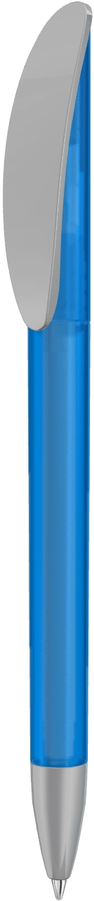 Drehkugelschreiber mit gedeckt silbernem Gehäuse, Bogenclip silber matt und schwerer Metallspitze matt verchromt.
