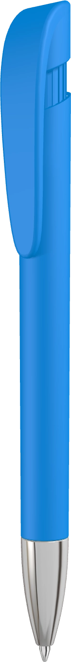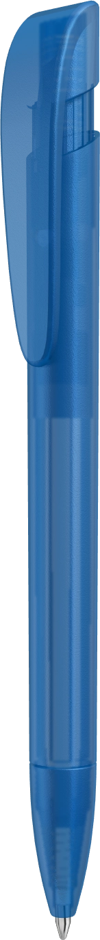 Druckkugelschreiber mit transparent gefrostetem Gehäuse, breitem Bogenclipdrücker und Spitze.