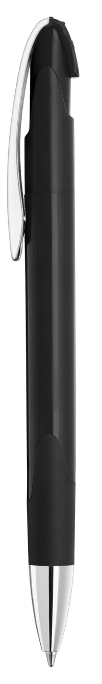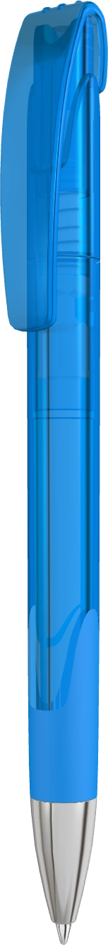Druckkugelschreiber mit transparent glänzendem Gehäuse, Gummigriffzone, schwerer Metallspitze und Metallclip glanzverchromt.