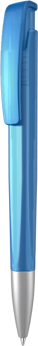 Druckkugelschreiber mit geometrisch wechselnder Schaftform, transparent gefrostetem Gehäuse und Metallspitze matt verchromt.