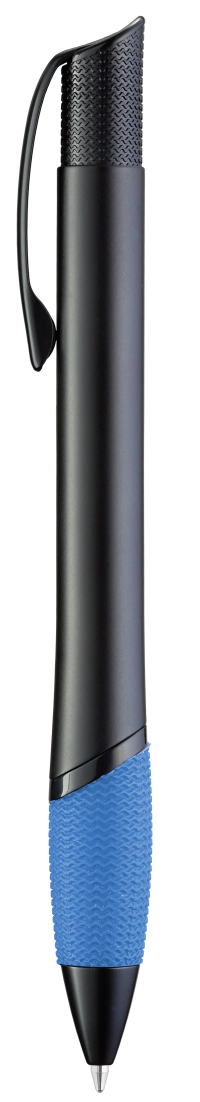 Metall-Druckkugelschreiber mit glänzendem Gehäuse, schwarzer Gummigriffzone und glanzverchromten Beschlagteilen.