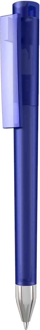 Drehkugelschreiber mit gedeckt glänzendem Gehäuse und Oberteil mit zwei farbigen Stopfen in gedeckt oder transparent. Schwere Metallspitze glanzverchromt.