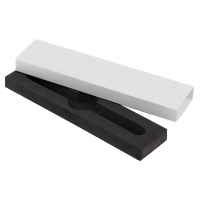 Étui en plastique transparent avec support en plastique. Le stylo bille est fixé de manière flottante dans l'étui.