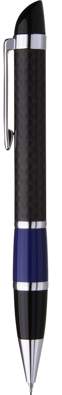 Stylo bille à rotation en fibre de carbone noble avec clip en métal flexible, anneau décoratif et pointe en métal chromés brillants. Grip caoutchouc coloré.